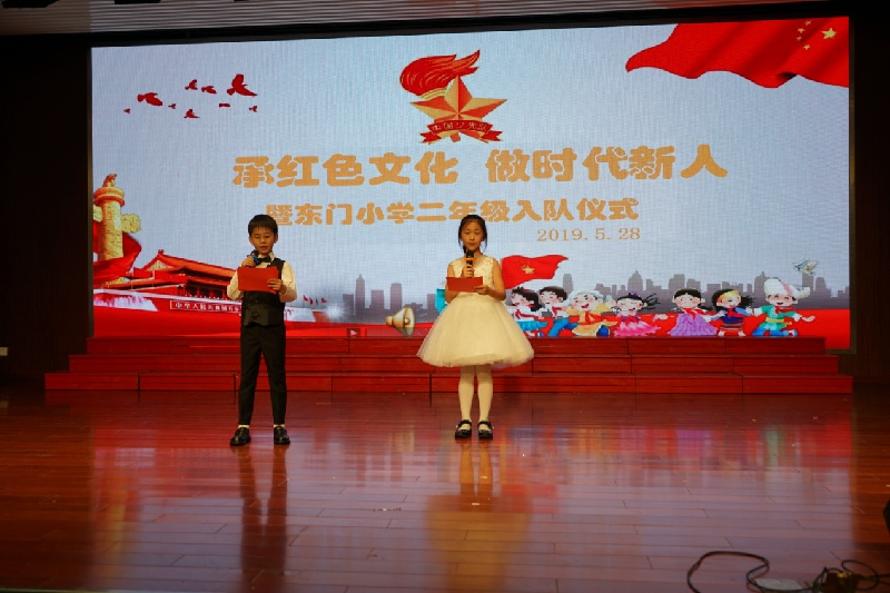5月28日下午,东门小学二年级队员及其家长在东方中学小剧场举行了“承红色文化做时代新人”主题入队仪式。